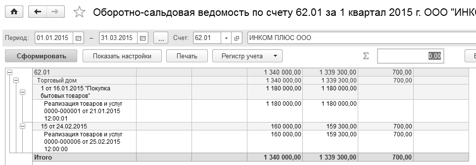 Сформируйте отчет "Оборотно-сальдовая ведомость по счету" 62.01 за 1 квартал 2015 года. По договору "Ремонт оборудования" контрагент ООО "Торговый дом" остался должен ООО "ИНКОМ ПЛЮС" сумму 700 руб.
