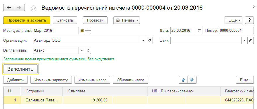 Начислим заработную плату за месяц март всем сотрудникам ООО "Авангард".