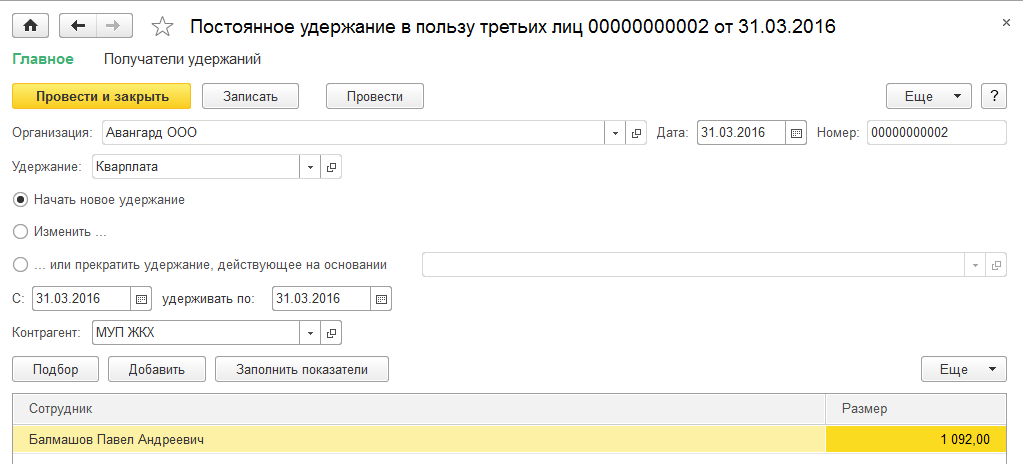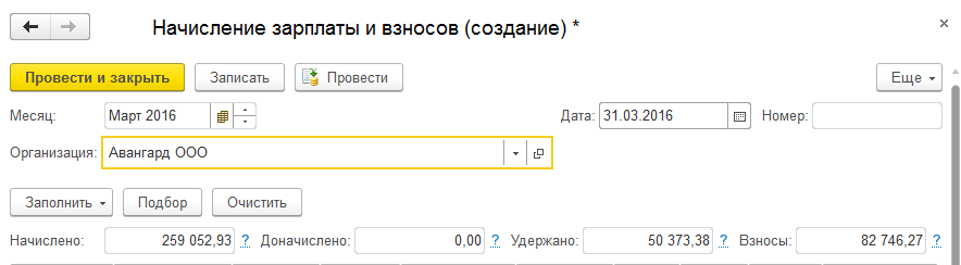 Начисление зарплаты. Окончательный расчет выполняется в документе "Начисление зарплаты и взносов", а также расчет НДФЛ и взносов.