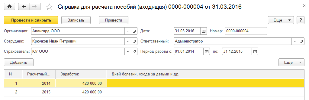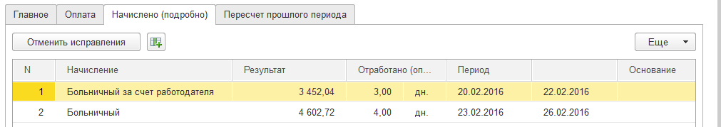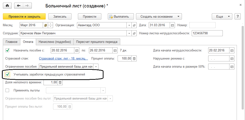 Во вновь созданном документе на вкладке "Оплата" установим флаг "Учитывать заработок предыдущих страхователей", перерасчет будет произведен автоматически. Проверим и проведем документ.