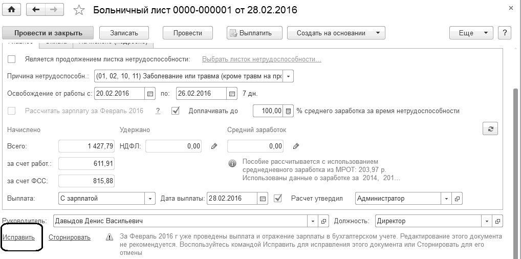 Обратите внимание, что на практике могут встречаться ситуации, когда после расчета зарплаты появляется информация о неучтенных премиях, приказах, уточнениях сроков отпуска и т.п. В этом случае необходимо ввести уточняющий документ, а затем перерасчитать документ "Начисление зарплаты и взносов" (перезаполнение может потребоваться, если изменилась плановая информация).