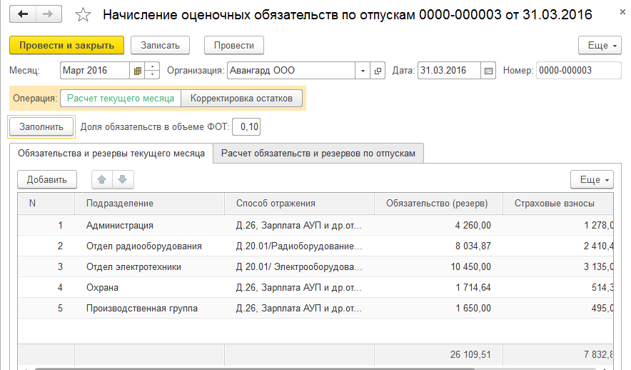 Отражение зарплаты в учете. Для подготовки данных к передаче в бухгалтерию формируется документ "Отражение зарплаты в учете". Если ведется учет оценочных обязательств, то также создается документ "Начисление оценочных обязательств по отпускам".