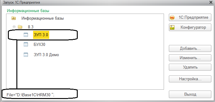 В окне запуска отображается список информационных баз, с которыми может работать пользователь. Список этот может быть достаточно большим, а путь доступа к папке, где находятся файлы нужной нам базы, можно прочитать внизу окна.