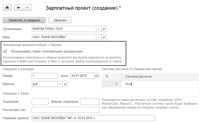 10.01.2015 г. создаете документ "Зарплатный проект". Занесите в форму ОАО "Банк Москвы", договор № 1 от 10.0.1.2015 года. В табличную часть добавьте систему расчетов VISA (рис. 3.4.2).