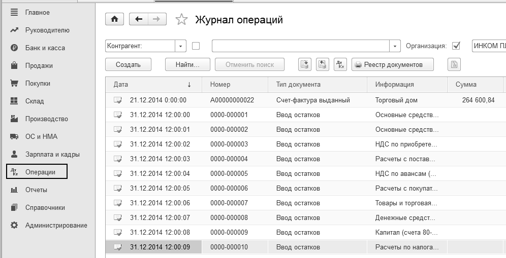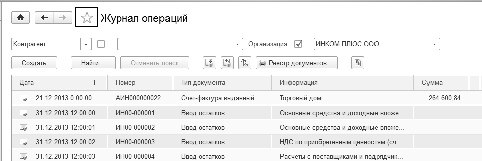 В журнале операций отображаются все операции, введенные документами конфигурации, с использованием типовой операции или вручную.