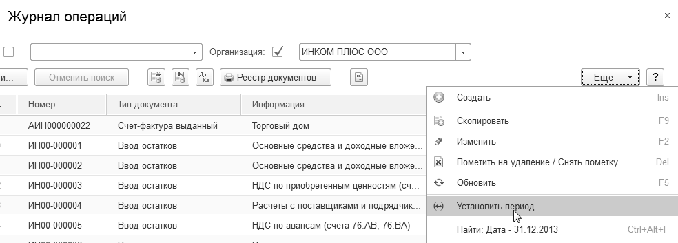 Если список операций в Журналах ограничен отчетным периодом, можно воспользоваться пунктом меню "Еще/Установить период" (рис. 5.4.2).