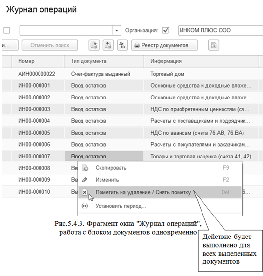 В списках документов (журналах, списках справочников) можно проводить, отменять проведение, устанавливать и снимать пометку удаления, выполнять другие действия для нескольких документов (элементов справочника) одновременно. Дополнительные обработки при этом не требуются (рис. 5.4.3).