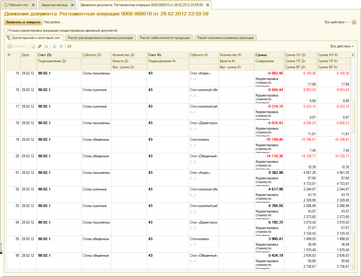 Еще раз обратимся к форме помощника Закрытие месяца, и откроем проводки регламентной операции Закрытие счетов 20,23,25,26. На закладке Бухгалтерский и налоговый учет найдем интересующие нас проводки. Как и в случае с корректировкой производственной себестоимости, здесь также формируется по две проводки на каждую номенклатурную позицию реализованной продукции.