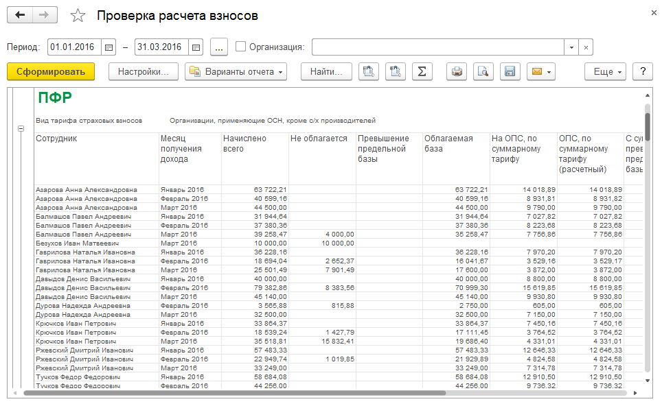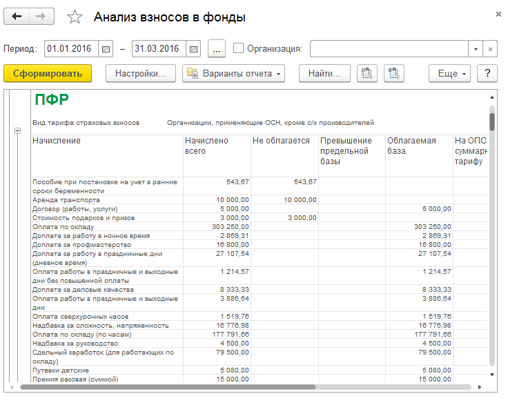 Данный отчет позволяет проанализировать включение доходов в базу по взносам, применение различных тарифов взносов, и исчисленные суммы по взносам.