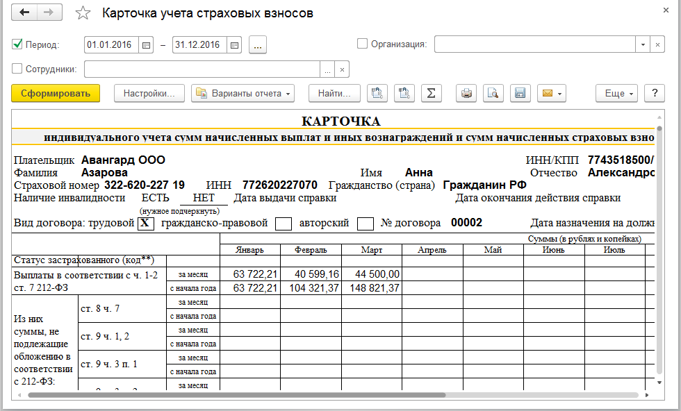 В отчете формируется регламентированная форма карточки по страховым взносам по каждому сотруднику.