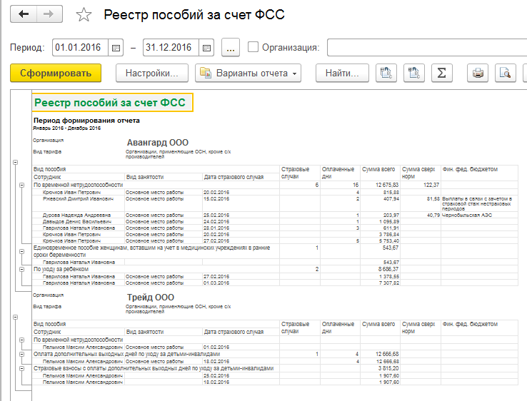 В отчете можно проанализировать суммы, возмещаемые организацией в ФСС по видам пособий.