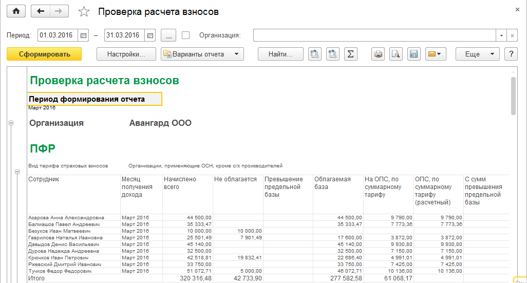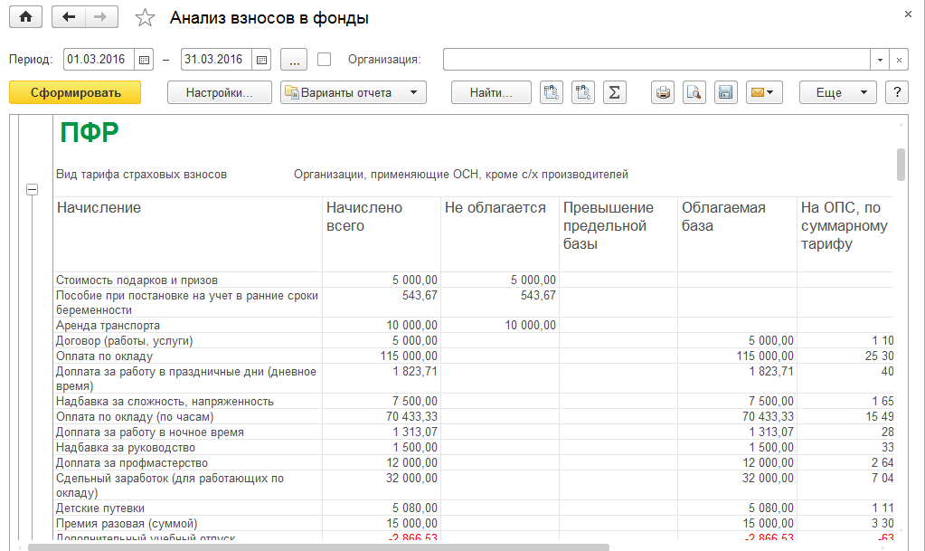 Данный отчет позволяет проанализировать включение доходов в базу по взносам, применение различных тарифов взносов, и исчисленные суммы по взносам.