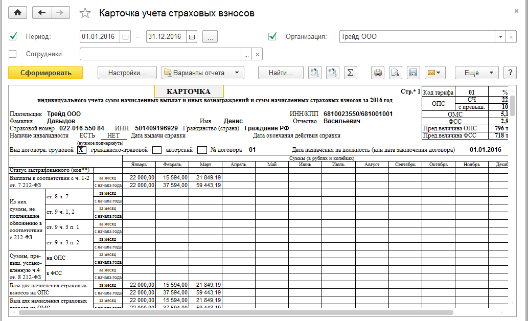 В отчете формируется регламентированная форма карточки по страховым взносам по каждому сотруднику.