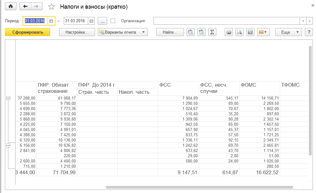 По каждому сотруднику показываются общие суммы по налогам и взносам за выбранный период.