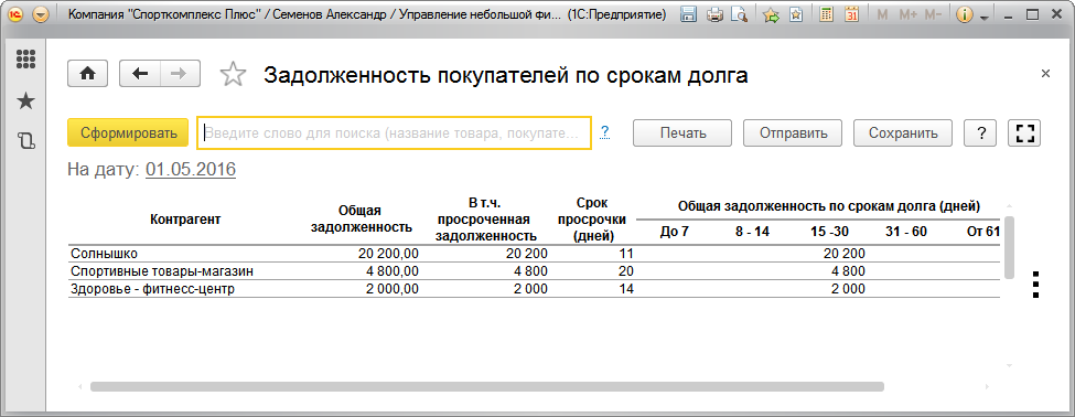 Для анализа структуры дебиторской задолженности по срокам ее возникновения предназначен отчет "Задолженность покупателей по срокам долга". Очень важно классифицировать долги по срокам их возникновения. Ведь известно, что чем "старее" долг, тем меньше вероятность его вернуть. Информация, представленная в отчете "Задолженность покупателей по срокам долга" поможет руководителю небольшой фирмы понять, по каким покупателям существует относительно "свежая" задолженность, а значит – надо предпринять более активные меры по ее устранению, чтобы она не перешла в разряд "старой". По более старым долгам, опять же на основании информации, представленной в отчете, наоборот – может быть принято решение о списание долга в связи с крайне низкой вероятностью его возврата.