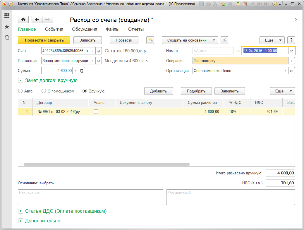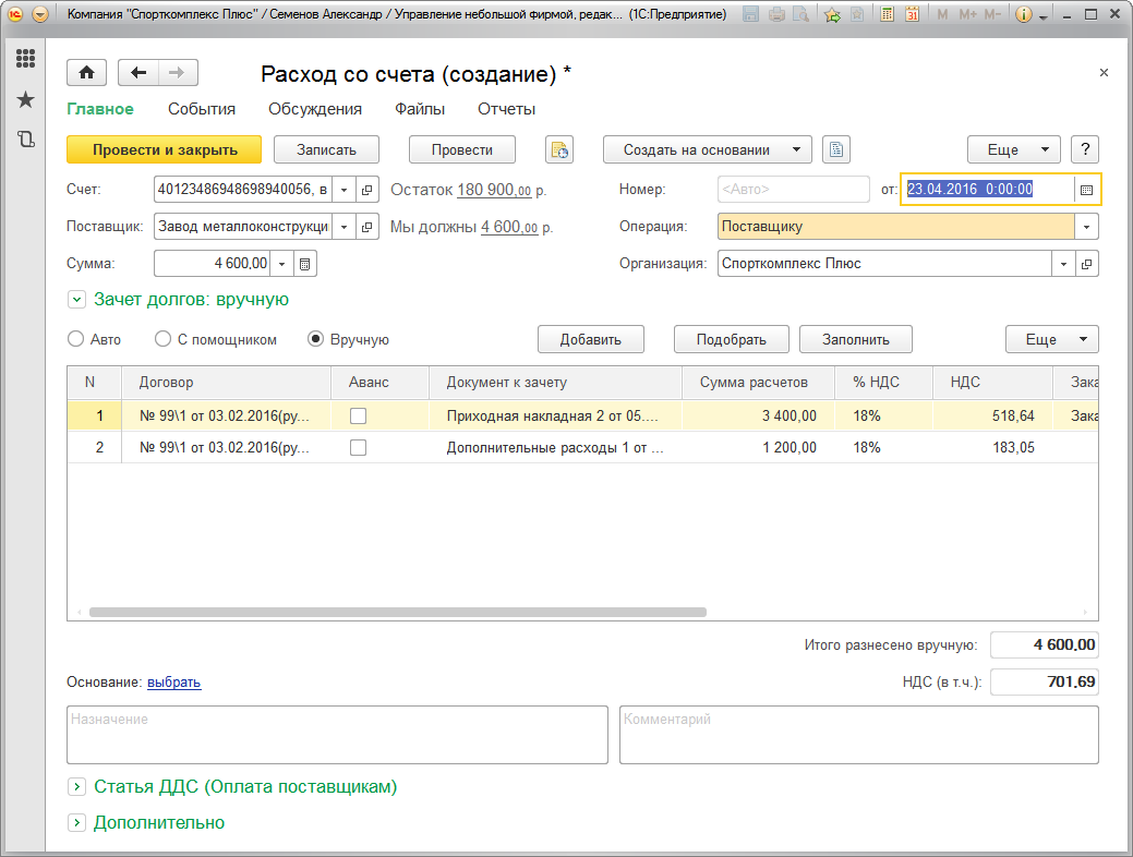 В данном примере мы решили распределить 4600 рублей платежа следующим образом – полностью погасить долг по приходной накладной № 2, а остаток платежа отнести на документ "Дополнительные расходы".