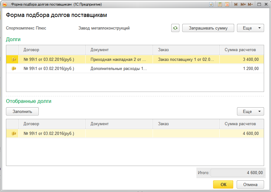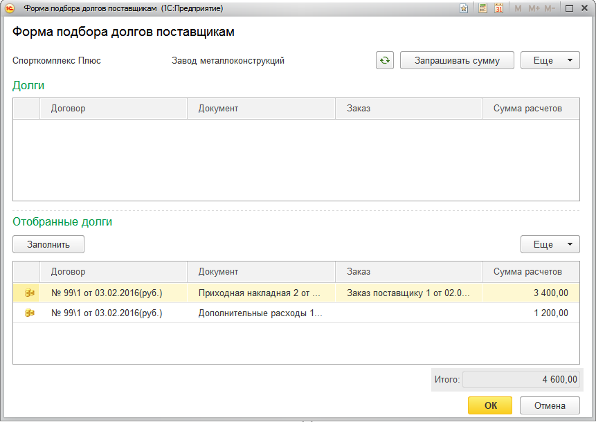 Рис. 175. Форма подбора долгов при оплате поставщику