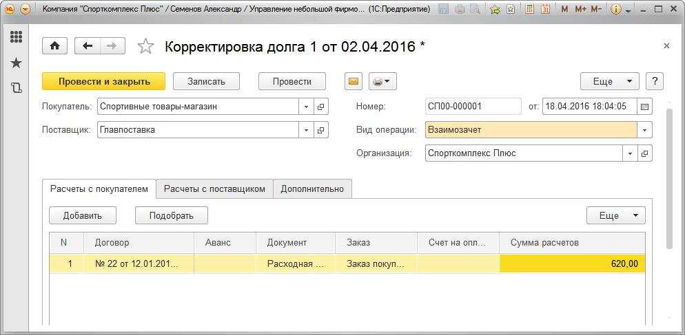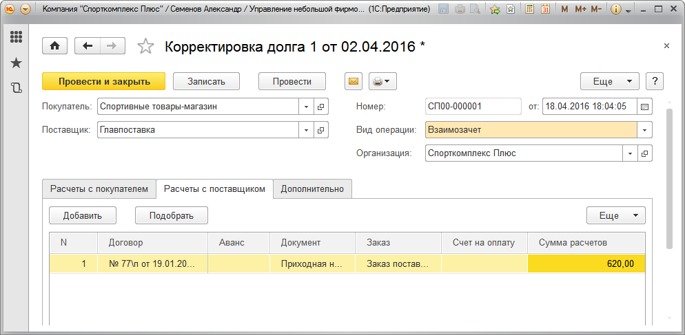 Рис. 180. Документ "Корректировка долга" с видом операции "взаимозачет", вкладка "Расчеты с поставщиком"
