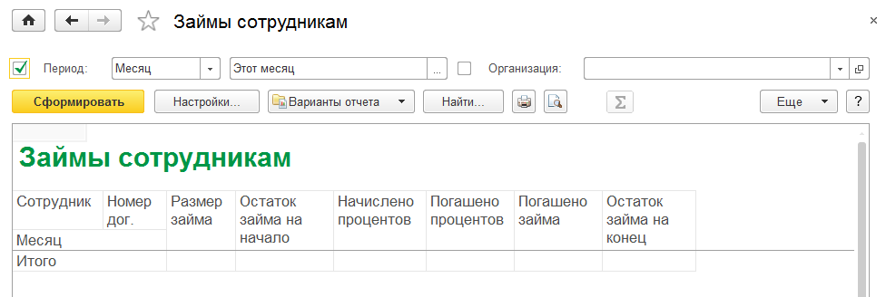 Данный отчет позволяет проанализировать удержания в счет погашения займов сотрудников и остатки по займам на конец выбранного периода.