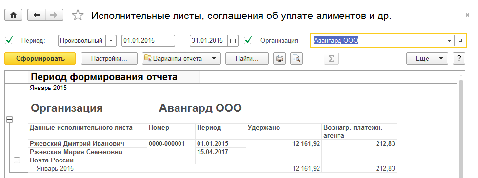 Отчет позволяет вывести информацию об удержанных суммах по исполнительным документам для перечисления получателям.