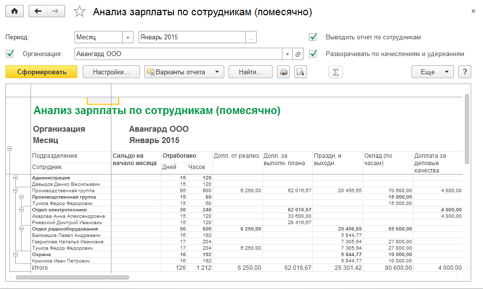 Анализ зарплаты по подразделениям и сотрудникам – представляет собой расчетную ведомость в произвольной форме, где указываются все начисления и сотрудники, которым они были начислены (в шахматном порядке). При этом ведомость собирается нарастающим итогом за несколько месяцев без разбивки по отдельным месяцам.