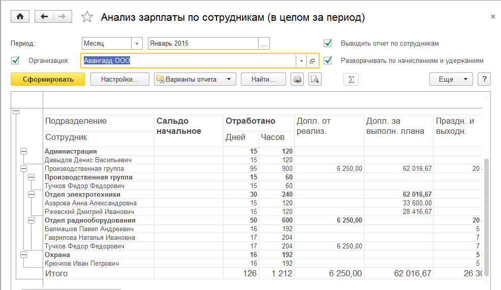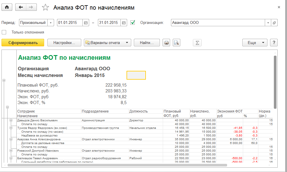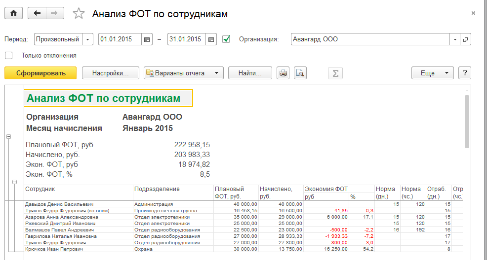 В отличие от предыдущего варианта, отчет позволяет проанализировать использование планового ФОТ в целом по каждому сотруднику.