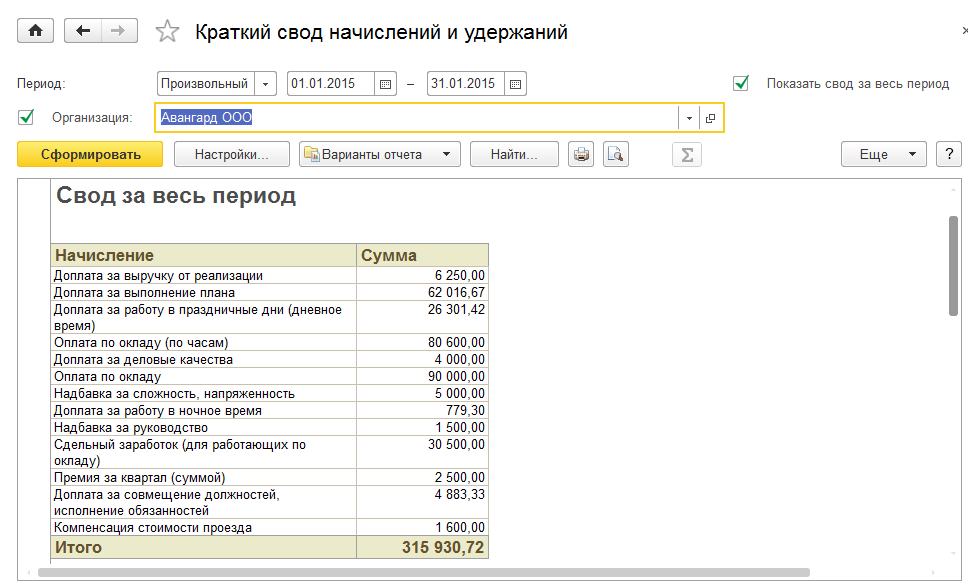 Отчет позволяет просмотреть общие суммы по начислениям и удержаниям как в целом за период, так и помесячно.