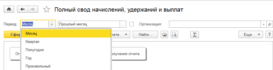В отчетах указывается период, за который нужно получиться данные, и организация.