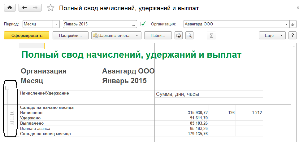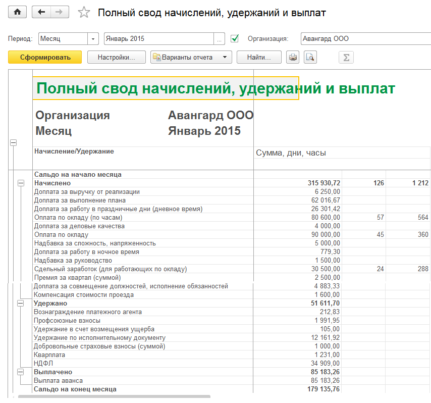 Полный свод начислений, удержаний и выплат – показывает общие суммы начислений и удержаний сотрудников, сальдо по взаиморасчетам за выбранный период.