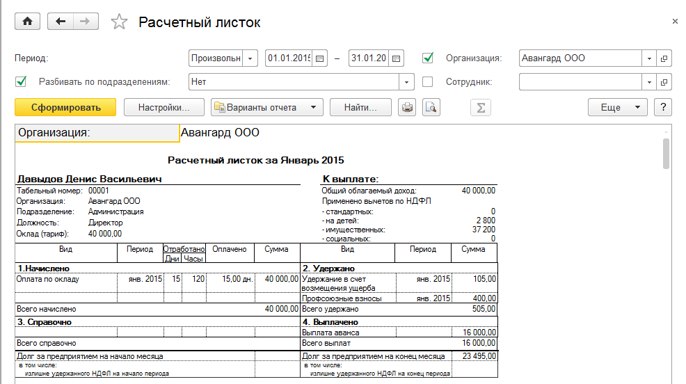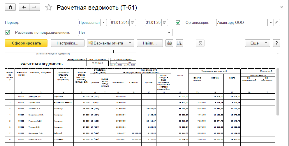 Сформируем различные отчеты по зарплате для организации ООО «Авангард» из раздела "Зарплата / Отчеты по зарплате" за январь 2015 г., указав для каждого период – произвольный (с 01.01. по 31.01.2015)