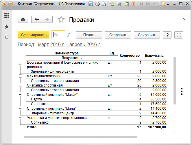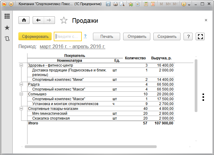 Рис. 89. Отчет "Продажи", в натуральном и стоимостном выражении, в разрезе номенклатурных позиций и покупателей, в порядке убывания суммы продаж
