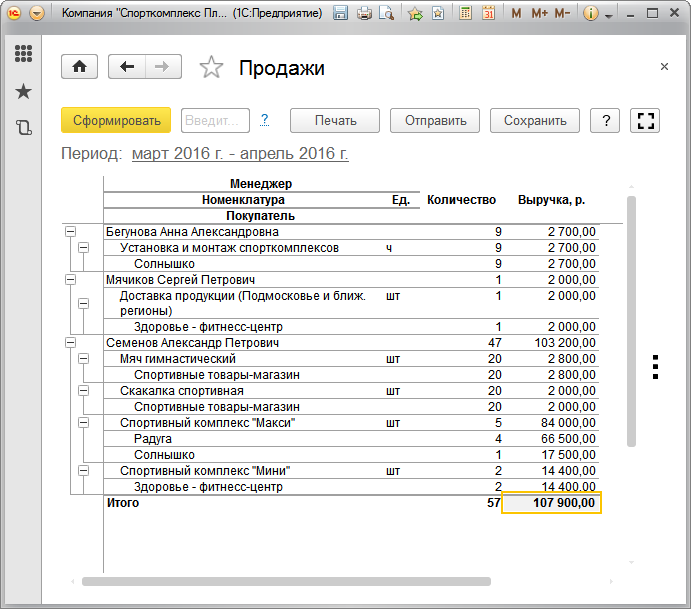 Рис. 90. Отчет "Продажи" в натуральном и стоимостном выражении, по менеджерам, ценовым группам и номенклатурным позициям, в порядке убывания суммы продаж