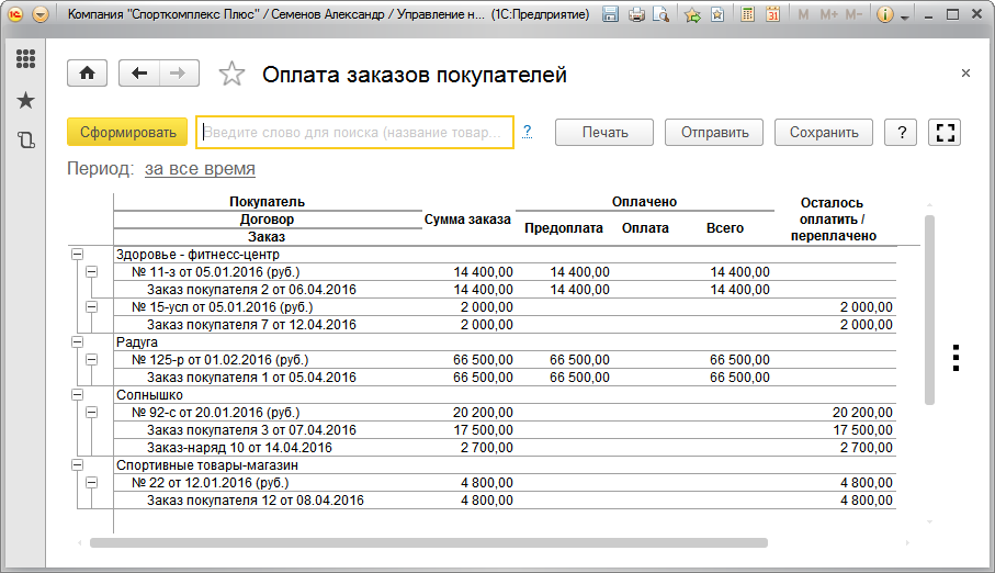 Напомним, что в отчет "Анализ оплаты по заказам покупателей" не включаются суммы, оплаченные клиентами безотносительно заказа (например, по счету на предоплату).