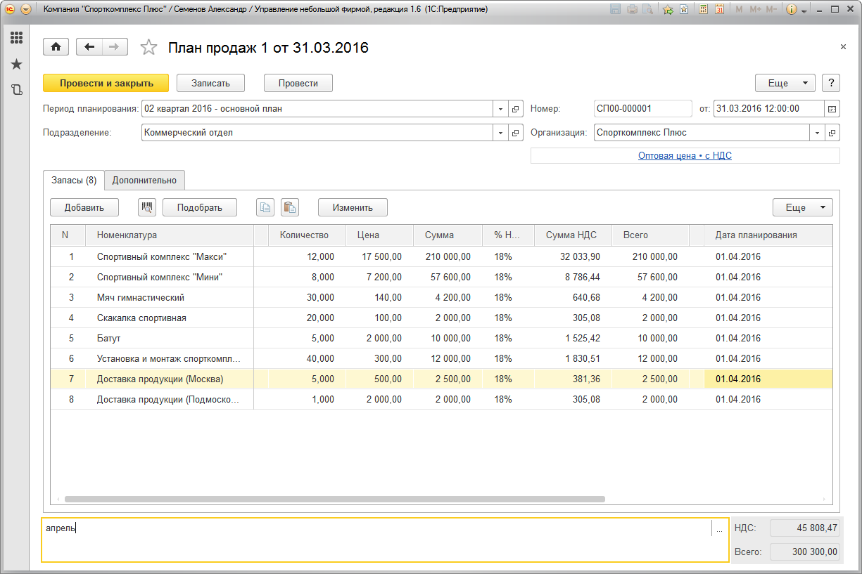 В табличной части документа необходимо вручную указывать все номенклатурные позиции и планируемые объемы продаж в натуральном выражении. Суммы продаж и НДС рассчитываются автоматически – по типу цен, указанному здесь же в документе (в примере на рисунке – Оптовая цена).