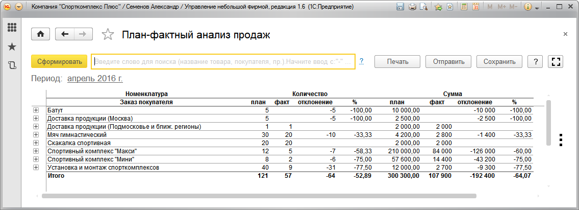 Итак, пришло время провести анализ выполненных продаж. Во-первых, необходимо получить данные о том, сколько, чего и кому мы продали за интересующий период времени, в натуральном и стоимостном выражении. Причем, нас будет интересовать информация в различных аналитических разрезах – по номенклатурным позициям, по клиентам, по менеджерам и т.д. Во-вторых, нам важно узнать, соответствуют ли эти продажи тем объемам, которые были запланированы, и выявить отклонения.