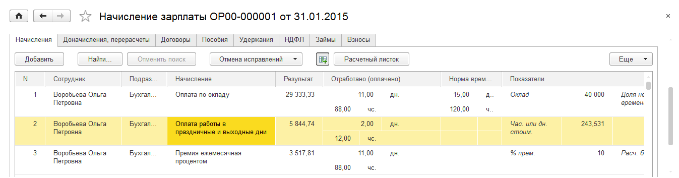 Воробьевой О.П  -начисление за работу в выходные и праздничные дни :