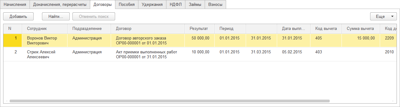 На закладке Договоры - Суммы начисленные Воронову В.В и Стрижу А.А по договорам
