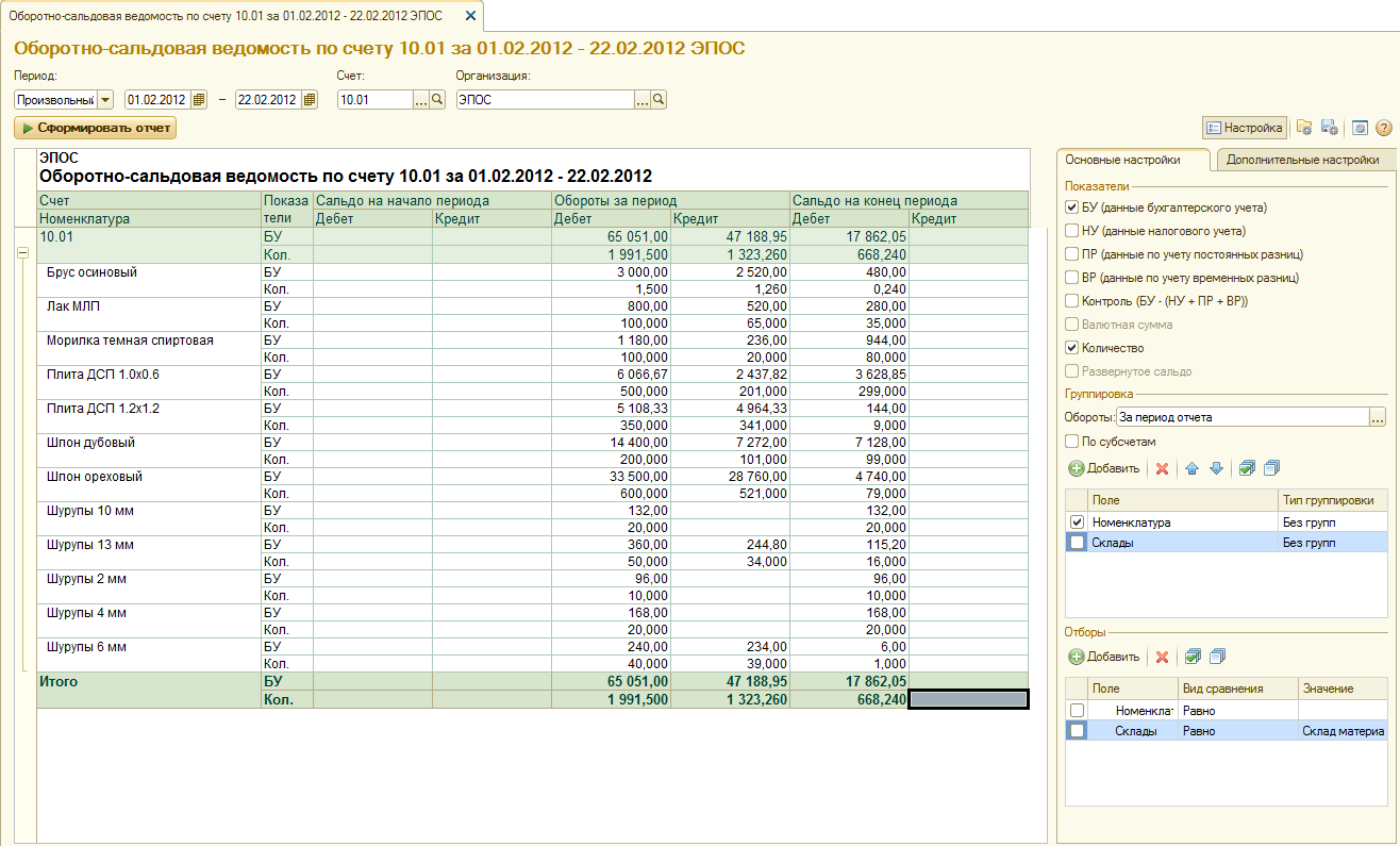 Первый отчет позволяет получить информацию о сальдо на начало периода, обороте по дебету и кредиту за период и о сальдо на конец периода на счете 10 «Материалы». С помощью второго отчета можно получить информацию о корреспонденции счетов в операциях поступления и выбытия материалов.