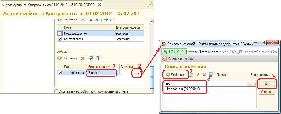 – в разделе Отборы для субконто Контрагенты установить вид сравнения В списке, в колонке Значение открыть форму списка значений, добавить в него поочередно анализируемые субконто Фрезер Завод, Прогресс ЗАО и Атлант НПО (выбором из справочника Контрагенты) и по кнопке <ОК> включить список в отбор (рис. 9-52);