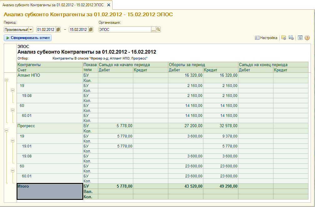 Это можно сделать, сформировав, например, отчет Анализ субконто за период с 01.02.2012 по 15.02.2012 для вида субконто Контрагенты включив в отбор значения субконто Фрезер Завод, Прогресс ЗАО, Атлант НПО (если отбор не установлен, в одном отчете будут показаны данные по всем контрагентам).