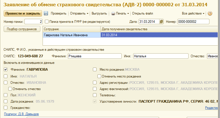 При выборе сотрудников заполняются их личные данные, если данные были введены корректно, то документ готов к отправке.