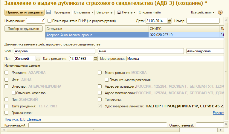 Проведение документа означает, что данные переданы в отделение ПФР. Пачку можно передать в архив, установив соответствующий флажок.
