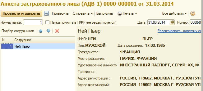 Создадим анкету АДВ-1 для П.Нея от 31.03.2014