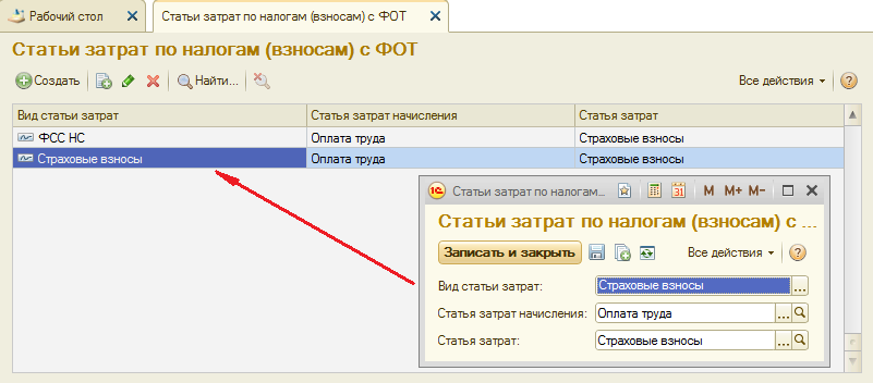 Для отражения их по статьям затрат, отличным от тех, на которых обобщается информация о расходах на оплату труда, необходимо в списке Статьи затрат по налогам (взносам) с ФОТ (через Панель разделов → Сотрудники и зарплата → Справочники и настройки → Статьи затрат по налогам (взносам) с ФОТ) указать правила соответствия.