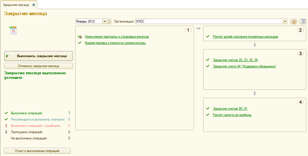 · выполнить все необходимые операции закрытия месяца в правильной последовательности;
