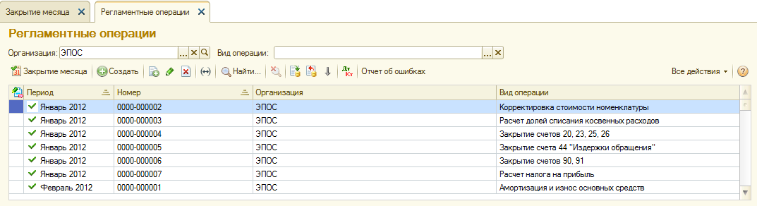 Помощник закрытия месяца представляет набор регламентных операций, обязательных для выполнения при завершении отчетного периода. Регламентные операции выполняются документами Регламентная операция, а также документами Формирование записей книги покупок, Формирование записей книги продаж, Начисление зарплаты и страховых взносов.