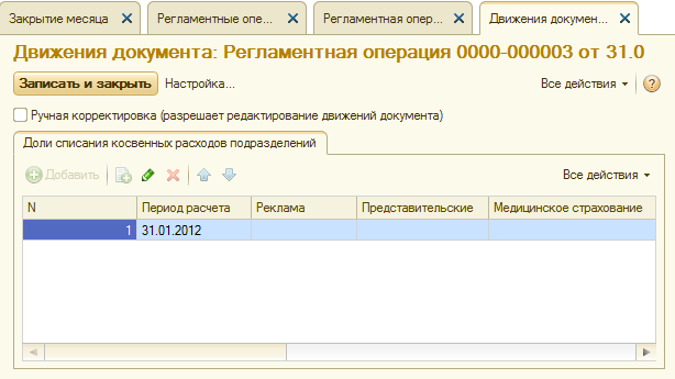 По операции Расчет доли списания косвенных расходов будет, как и в январе, введена «вспомогательная» запись в регистр Доля списания косвенных расходов подразделений.