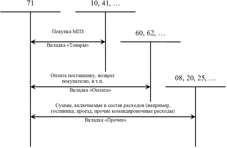 При проведении документа формируются бухгалтерские записи по дебету счетов, указанных в табличной части документа (в том числе счета учета НДС по приобретенным ценностям), и кредиту счета 71 «Расчеты с подотчетными лицами», соответствующим субсчетам (если отчет в рублях - то субсчета 71.01 «Расчеты с подотчетными лицами», если в иностранной валюте – то субсчета 71.02 «Расчеты с подотчетными лицами (в валюте)»).