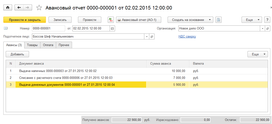 Информация о денежных средствах, полученных подотчетным лицом, отображается на закладке «Авансы». Здесь отражаются следующие документы: