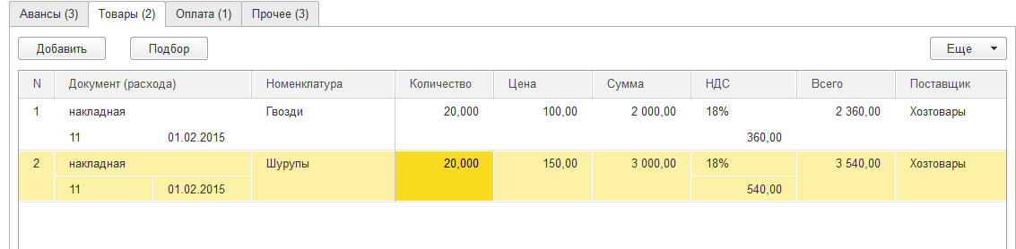 Информация о приобретенных подотчетным лицом МПЗ фиксируется на закладке «Товары», информация о приобретении возвратной тары фиксируется на закладке «Возвратная тара».
